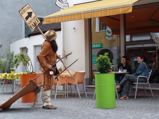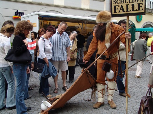 Wir reden wirklich von unserer Lieblingsarbeit. Wenn Sägenvier eine Kommunikationsarbeit belegen kann, mit der alle Disziplinen vereint und lustvollst gestaltet wurden, dann ist es diese Kampagne. Die Aufgabenstellung lautete, eine Studie über die häufigsten Schuldenfallen zu präsentieren. Wir wurden beauftragt, im Vorfeld zu sensibilisieren. Unsere Vision war, ein Schild zu gestalten, das auf Schuldenfallen (Handy-, Auto-, Kredit-, Sexinserate etc.) zeigt. Wir wussten, mit herkömmlicher Werbung können wir den mächtigen Werbeimpulsen nichts entgegenhalten. Wir brauchten etwas ganz Spezielles. Entweder die Heilsarmee, die vor den Geschäften singt und predigt oder eben dieser Schuldenfallen-Trapper waren unsere Vorschläge. Glücklicherweise entschieden wir uns für Johann. Und es war ein voller Erfolg. Die Vorbereitung und Sensibilisierung hat schließlich mitgeholfen, den Finanzführerschein in die Schule zu bringen. Kinder und Jugendliche bekommen jetzt Hilfe im Umgang mit Geld und Schulden.