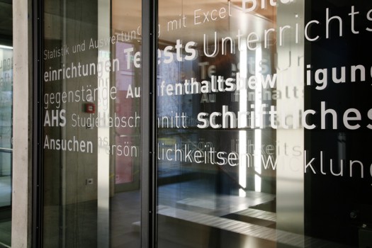 Die ersten Teile des Signaletik-Systems der Arbeiterkammer Vorarlberg sind fertiggestellt. Das Gebäude – geplant vom Architekturbüro Drescher + Kubina, München – besteht aus dem Altbestand und einem 4stöckigen Neubau. Gebäudekennzeichnung, Sichtschutzmaßnahmen, Codierung der Gebäudeteile, Kommunikation der Leistungen der AK Vorarlberg, Wartesituationen, Informationsinhalt, Atmosphäre… Klassische Parameter der Signaletik. Wir freuen uns schon, bis der Altbau fertiggestellt wird. Es entstehen einige Wartezonen mit typografisch aufbereiteten Geschichten rund um die Arbeitswelt und eine Story von Hermann Brändle für den Sichtschutz in der Bibliothek.