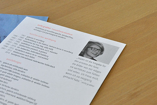Die Lustenauer Künstlerin Anita Grabher dürfen wir seit 2012 mit neuem Erscheinungsbild, neuer Website und neuem Katalog ausstatten. Wird sicher eine feine Arbeit. Zum Start haben wir diese Postkarte gestaltet. Liegt im Hotel auf, in dem die Bilder von Anita platziert sind. Wir freuen uns auf die Weiterentwicklung.