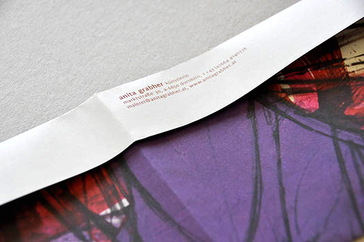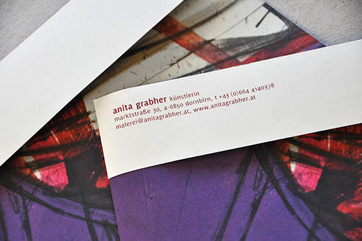 Die Lustenauer Künstlerin Anita Grabher dürfen wir seit 2012 mit neuem Erscheinungsbild, neuer Website und neuem Katalog ausstatten. Wird sicher eine feine Arbeit. Zum Start haben wir diese Postkarte gestaltet. Liegt im Hotel auf, in dem die Bilder von Anita platziert sind. Wir freuen uns auf die Weiterentwicklung.