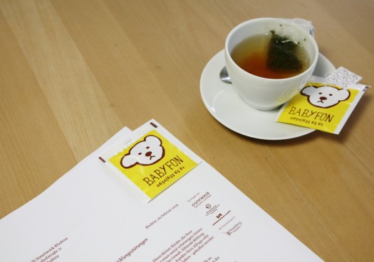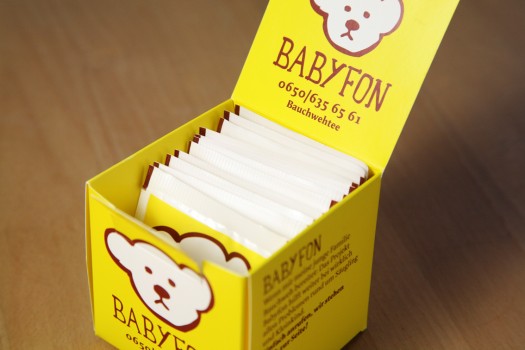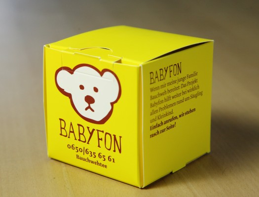 Die Aufgabenstellung vom IfS lautete, eine Telefonnummer für die Beratung Erziehungsberechtigter zu kommunizieren, die Schwierigkeiten mit der Kindererziehung haben. Es sollte ein Folder für Arztpraxen, für die Übergabe im Gemeindeamt etc. werden. Wir fanden den Begriff Babyfon passend und entschieden uns, einen Bauchwehtee als Transportmittel zu gestalten. Beim Bauchweh fängts auch manchmal an. Schreien, Wehklagen, nervtötende Nächte. Überforderung in der Erziehung. Wir sind überzeugt, dass hier nicht früh genug reagiert werden kann. Christian hat den Bär gemalt… Jööööhhhh.