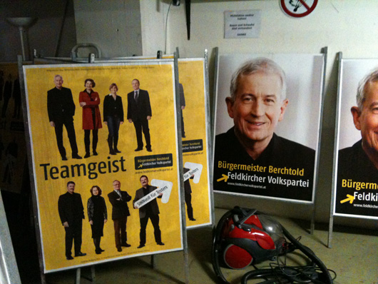 Das war ein Schrecken. Sämtliche Plakate der Wahlkampagne 2010 waren kaputt. Daumenbreite Falten in Wilfried Berchtolds Gesicht. In der Kälte kaschiert. Kaputt. Unbrauchbar und keine zusätzlichen bzw. übrigen Plakatsteher in Reserve. 3 Tage Zeit, den Schaden zu reparieren. Mit allen Nerven und aller Kraft haben wir es dann doch geschafft. Dank Eugen Wenin und seinem „Retter“-Team. Tag und Nacht kleistern, neu drucken. Im Keller trocknen… Bufffff.