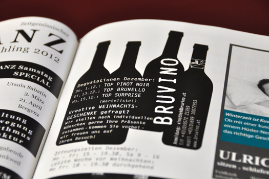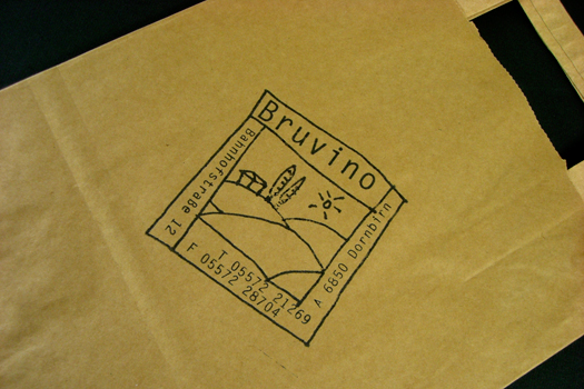 Bruno Fußenegger kam zu mir und ich schlug ihm spontan den Namen Bruvino vor. Es gefiel ihm sehr gut und das Naming war klar. Klaus Österle hat dann das Wortbildzeichen entworfen. Toskana pur. Der Duft der Olivenbäume. Ein kleines und gustiöses Corporate Design für ein schmackhaftes Thema.