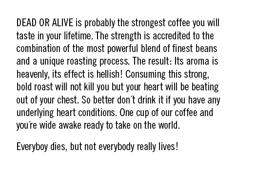 Die Kaffeemarke, bei der es um Leben und Tod geht. Der Kaffee ist sehr gut. Man stirbt gar nicht. Ist einfach ein sehr guter starker Espresso. Also keine Angst. Wir bereiten den Rollout 2018 vor. No Coffee for common people.