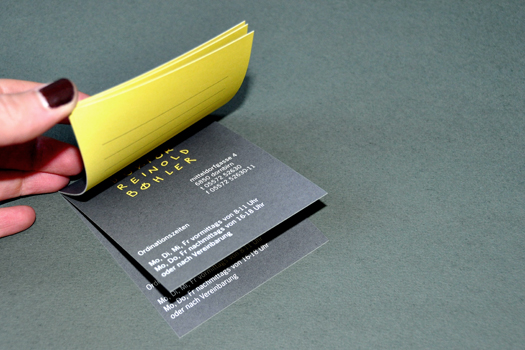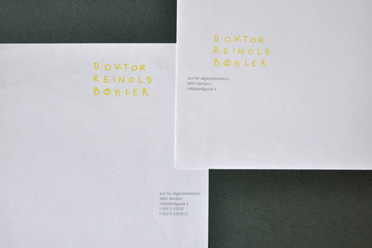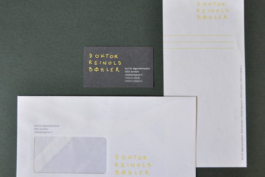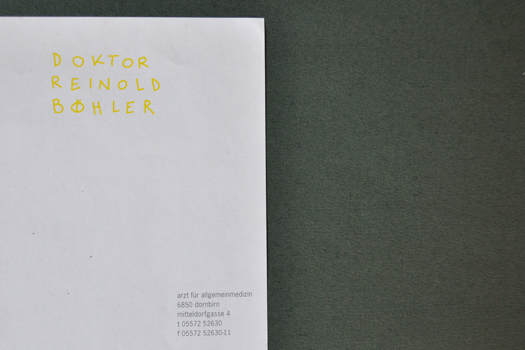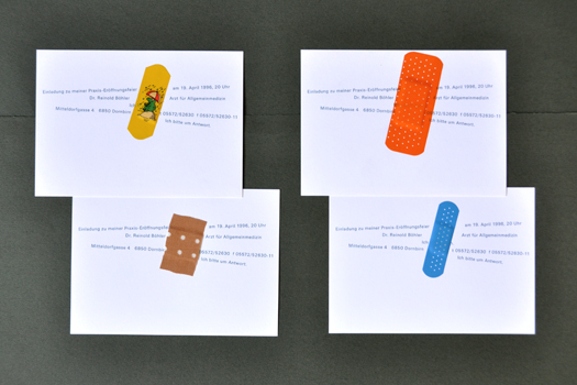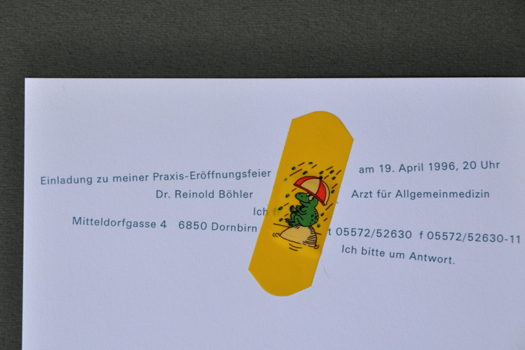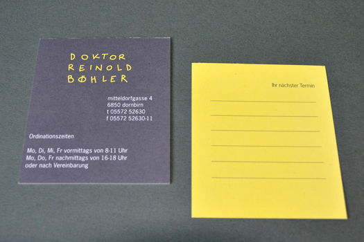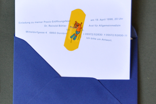 Ein praktischer Arzt mit langen Haaren und Roßschwanz. Ein lockerer Typ. Eine feine, kindlich anmutende Erscheinungsbildarbeit. Obwohl er kein spezifischer Kinderarzt ist, passt das Bild sehr gut. Und die Einladung zum Eröffnungsfest seiner Praxis finde ich besonders gelungen. Übrigens die Handschrift kommt von Klaus Österle.