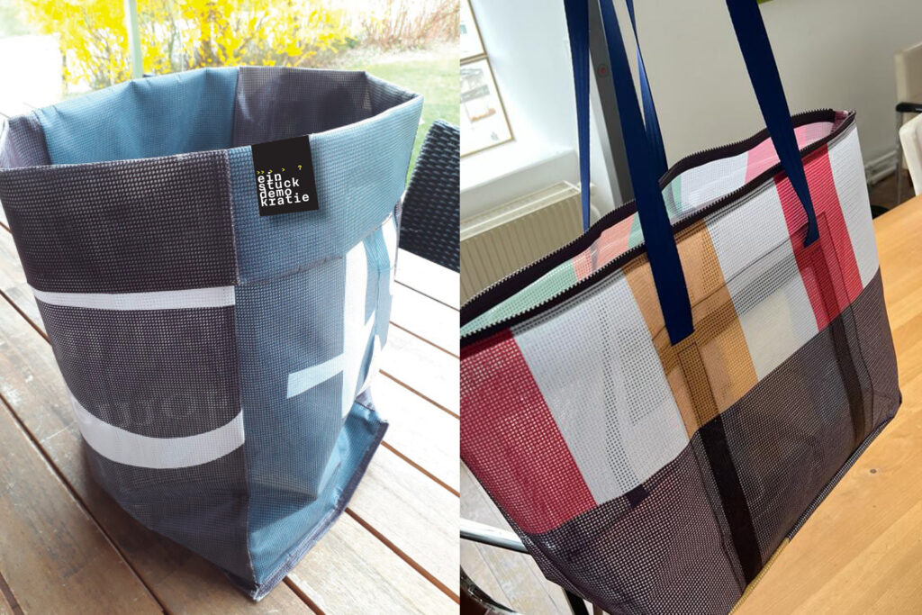 Nicht nur die sinnvolle Wiederverwendung dieser Menge an Material hat uns dazu bewogen, sondern auch die Notwendigkeit für Demokratie einzustehen und das Thema mit unseren superschönen Produkten etwas mehr in den Alltag zu bringen und in Erinnerung zu rufen.
