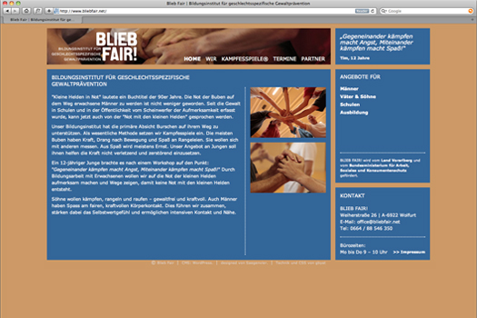 Unter dem Titel “Pädagogisch Kämpfen” durften wir das Erscheinungsbild, Postkarten und den Internetauftritt dieser interessanten “Therapie” mitgestalten. Die Jungs und auch ältere Männer werden hier mit Anweisung und Programm auf die Matte geschickt. Sie lernen die Grenzen ihrer Stärke und ihres Aushaltens kennen und lernen fürs Leben. Was es nicht alles gibt? Tolle Sache.