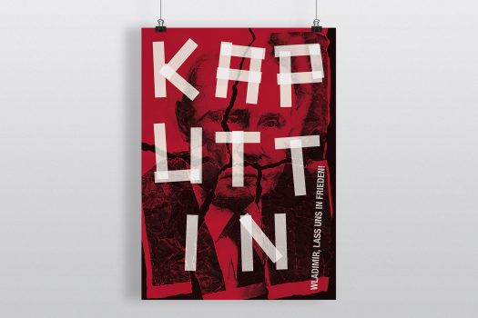 Elias und ich haben dieses Plakatsujet rasch nach dem Angriffskriegsausbruch gestaltet. Ich habe mir länger überlegt, ob wir uns dies trauen zu veröffentlichen. Ich denke – JA! Ist eine kleine Möglichkeit für uns Gestalter*innen, auf Themen zu reagieren. Übrigens ist das Wort Kapputin kein Aufruf Herrn Wladimir Putin kaputt zu machen, sondern unsere Meinung, daß es in seinem Kopf doch einiges zu reparieren gäbe – wenn dies überhaupt noch möglich ist. Solche Botschaften sind übrigens auch an alle anderen Hitzköpfe und totalitären Machthaber der Weltpolitik gerichtet. Wir hoffen, daß die Wahnsinne in Europa und auch in der ganzen Welt ein baldiges Ende nehmen.