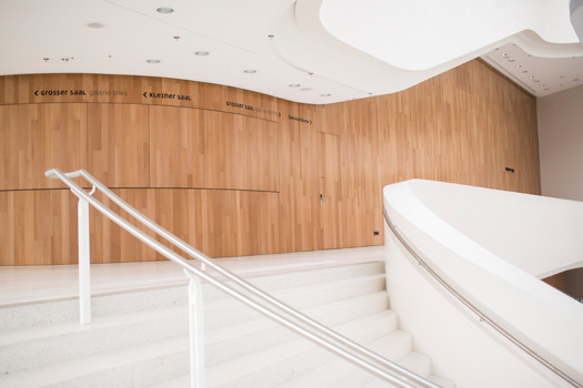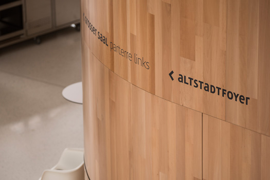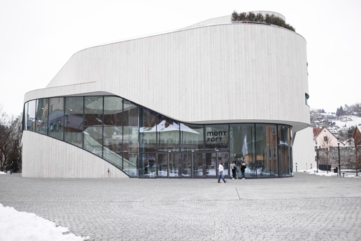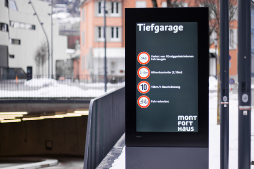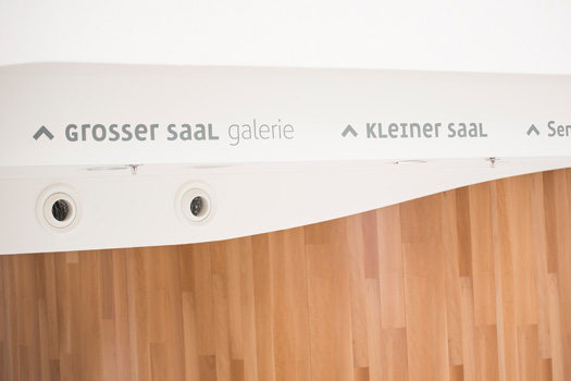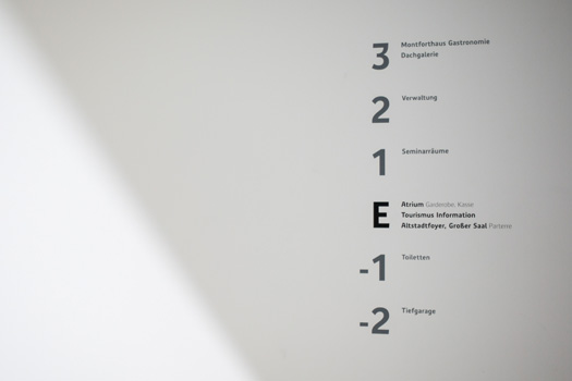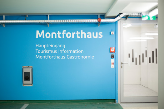 Nun ist es soweit. Das neue Montforthaus Feldkirch wurde Anfang Januar 2015 eröffnet. Mit den Architekten Hascher und Jehle, Berlin und Mitiska Wäger, Feldkirch ist eine neue Landmark in Vorarlberg entstanden. Wir in der Säge durften die Signaletik gestalten. Die von uns überarbeitete Schrift führt ruhig, unaufdringlich und klar durch das fliessende Gebäude. Der Anlaufschutz basiert auf der Idee mit Musik, Geräuschen der Baustelle, Lesungen aus Dokumenten der Stadtentwicklung, Aufnahmen von Menschen im Foyer, etc. Soundbilder zu generieren. Visualisierung von leise und laut, von Rythmus und Klang, vom Inhalt, der in diesem Gebäude stattfindenden Veranstaltungen. Unser Team ist sehr stolz, durch ein weiteres sehenswertes Gebäude mit unseren Signalen führen zu dürfen. Danke für die wundervolle Aufgabenstellung.
