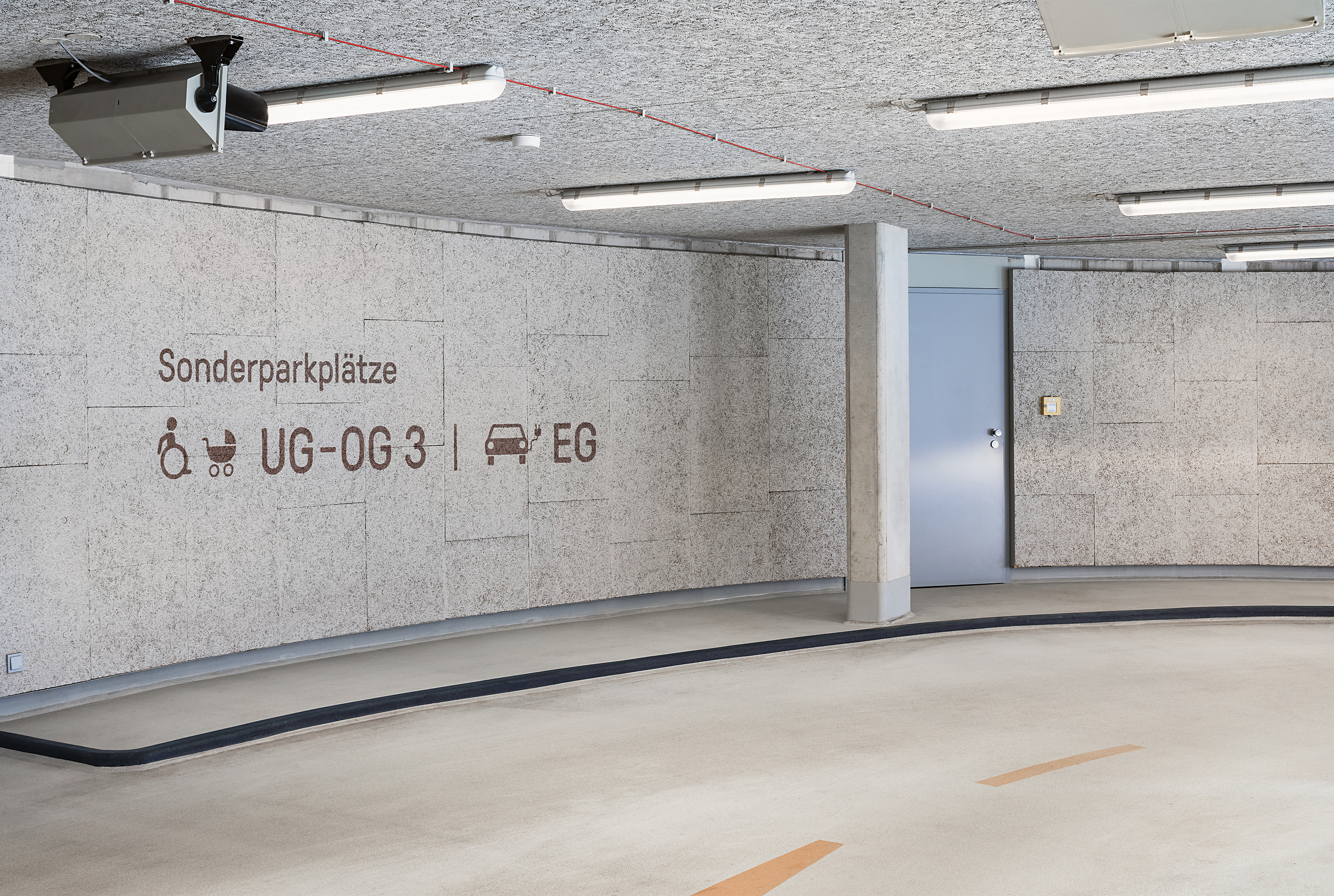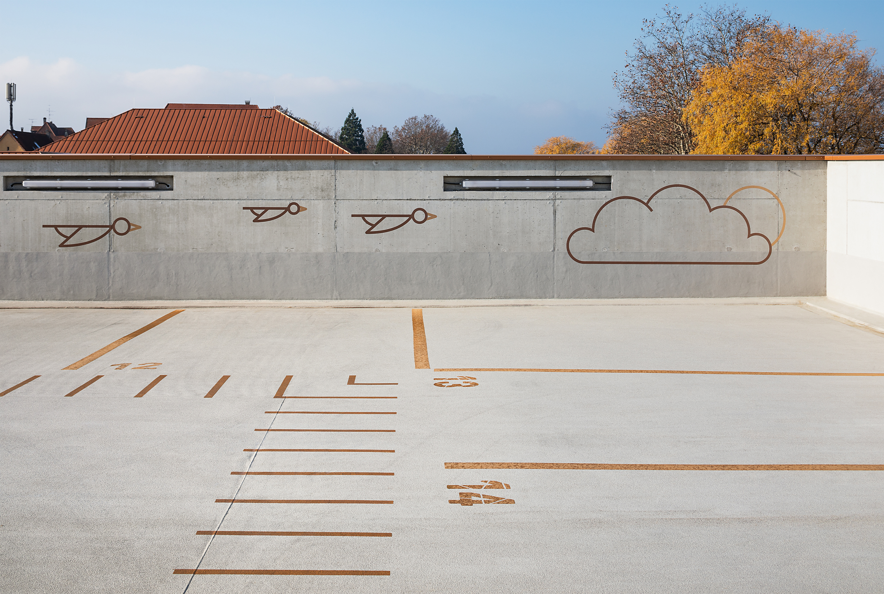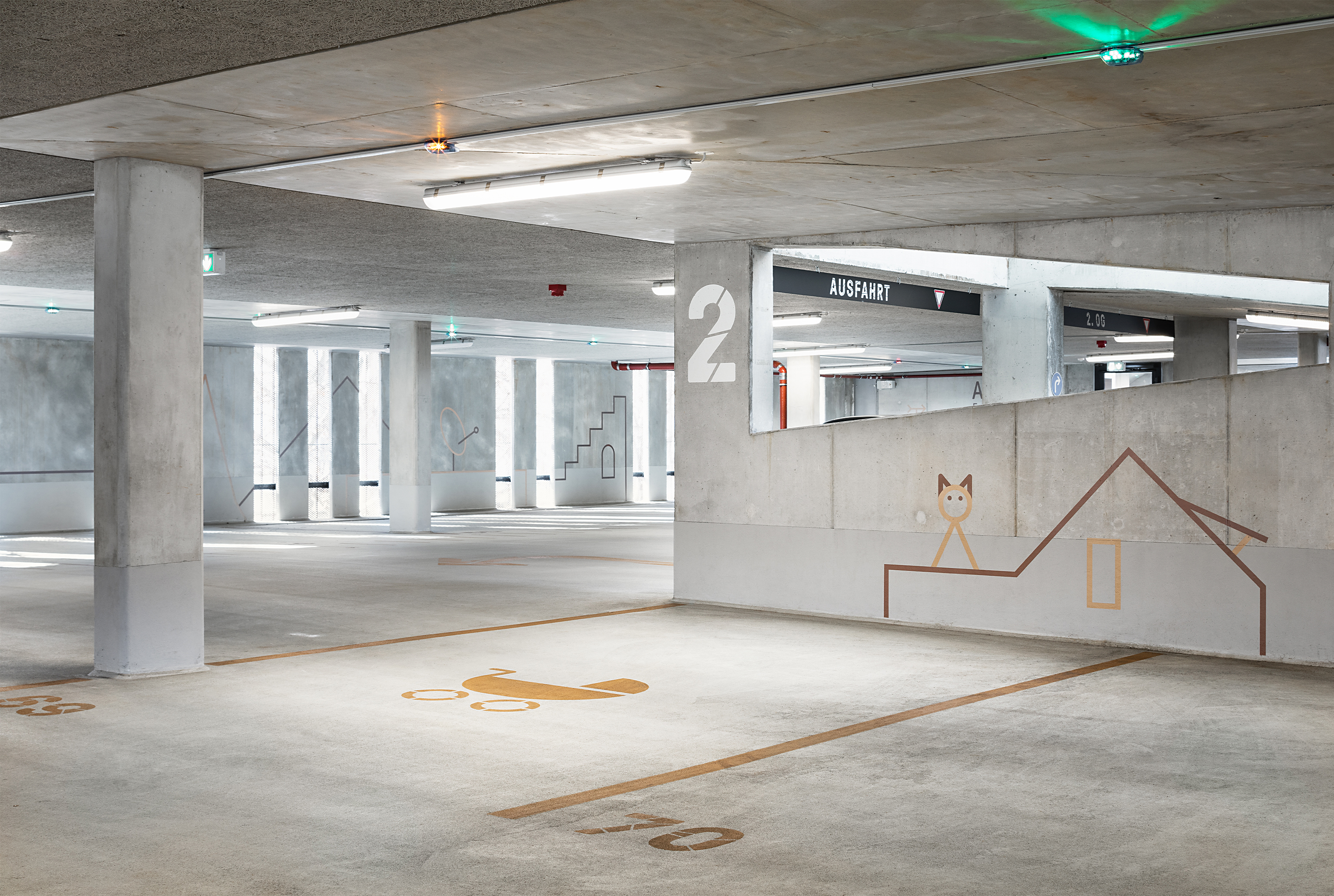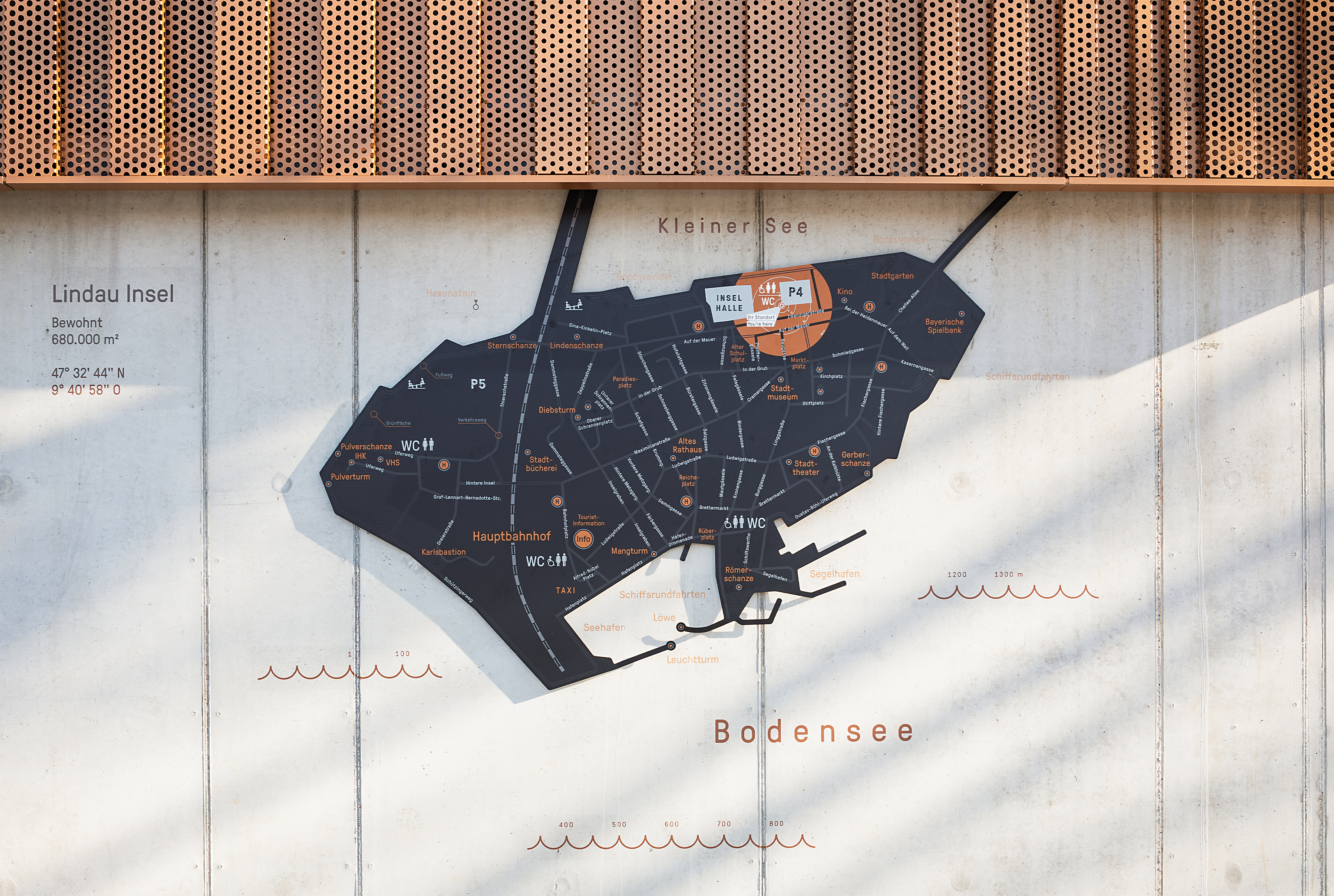 Herangehensweise: Die geometrisch abgeleitete Typografie (entwickelt aus der Drohnenperspektive) harmoniert mit den verwendeten Materialien. Im Anlaufschutz zitieren wir den Rhythmus der Fassade, im Parkhaus leiten und erzählen wir mit Kupferfarbe. Die Wandmalereien thematisieren szenografisch die Insellage: Unterwasserwelt/UG, Schifffahrt/EG, Baumkronen/OG1, Dächer/OG2 und Himmel/OG3.