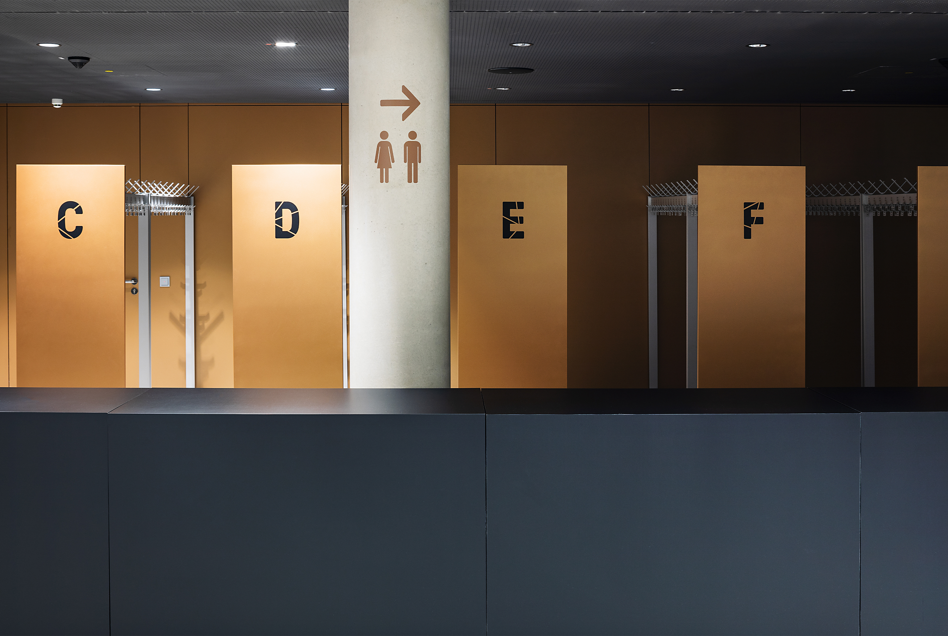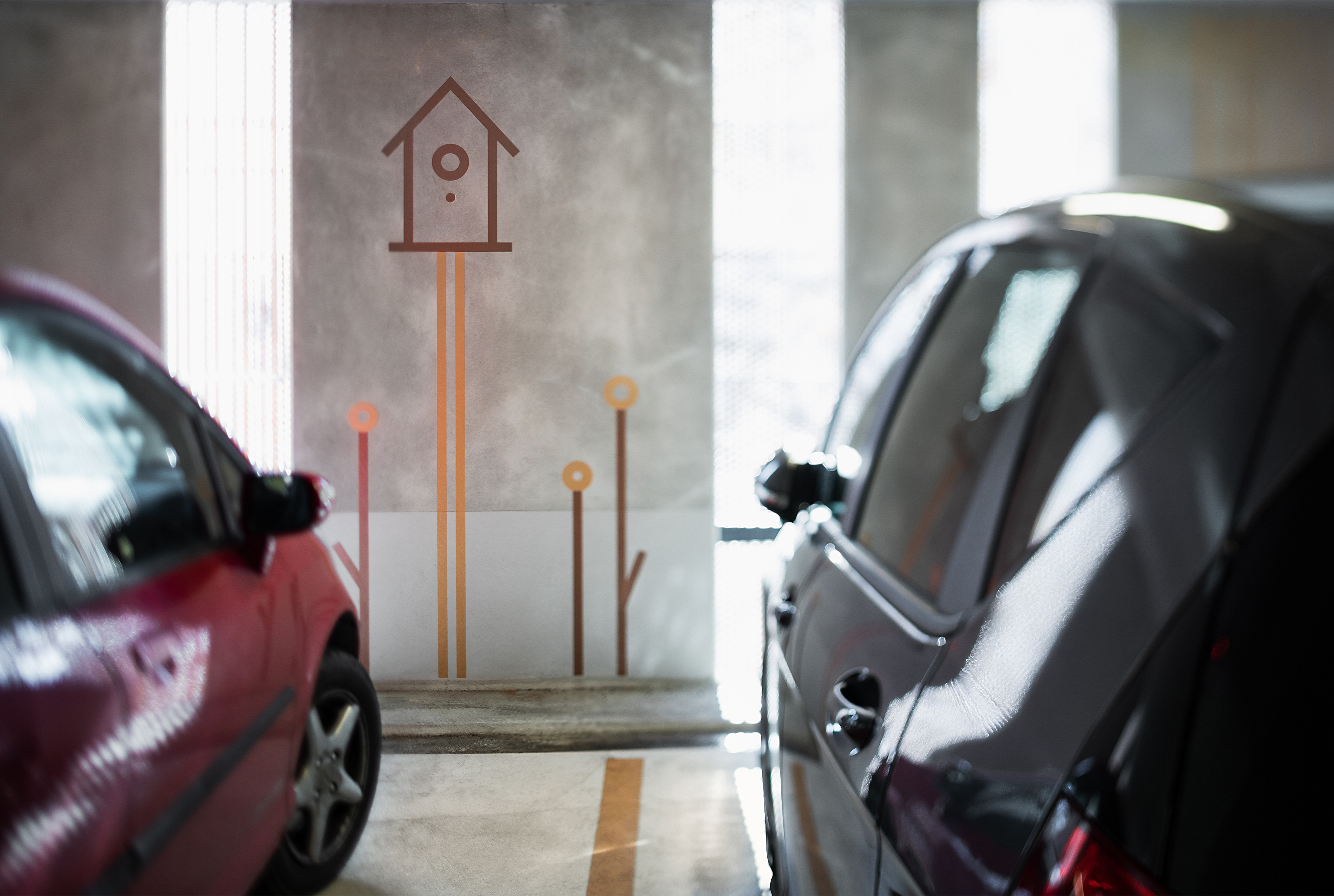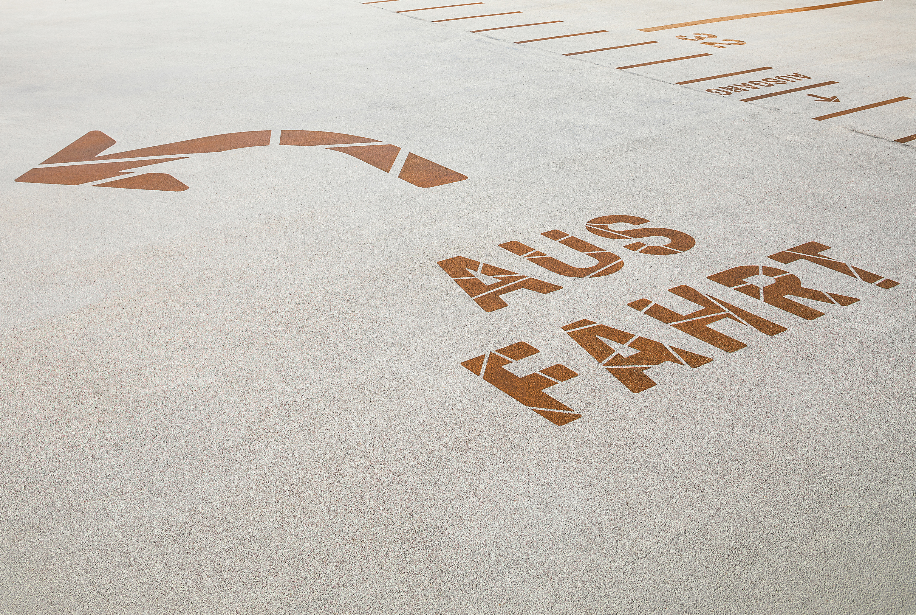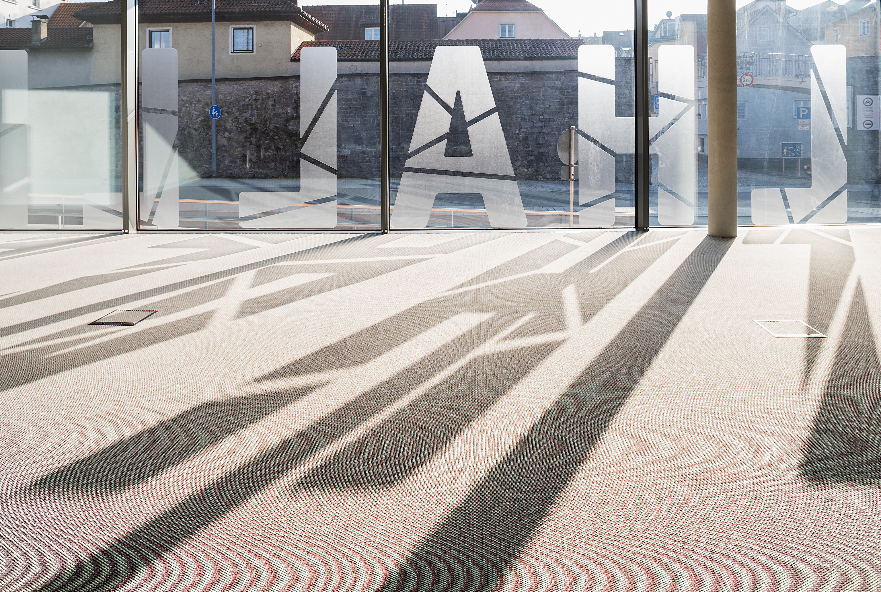 Herangehensweise: Die geometrisch abgeleitete Typografie (entwickelt aus der Drohnenperspektive) harmoniert mit den verwendeten Materialien. Im Anlaufschutz zitieren wir den Rhythmus der Fassade, im Parkhaus leiten und erzählen wir mit Kupferfarbe. Die Wandmalereien thematisieren szenografisch die Insellage: Unterwasserwelt/UG, Schifffahrt/EG, Baumkronen/OG1, Dächer/OG2 und Himmel/OG3.