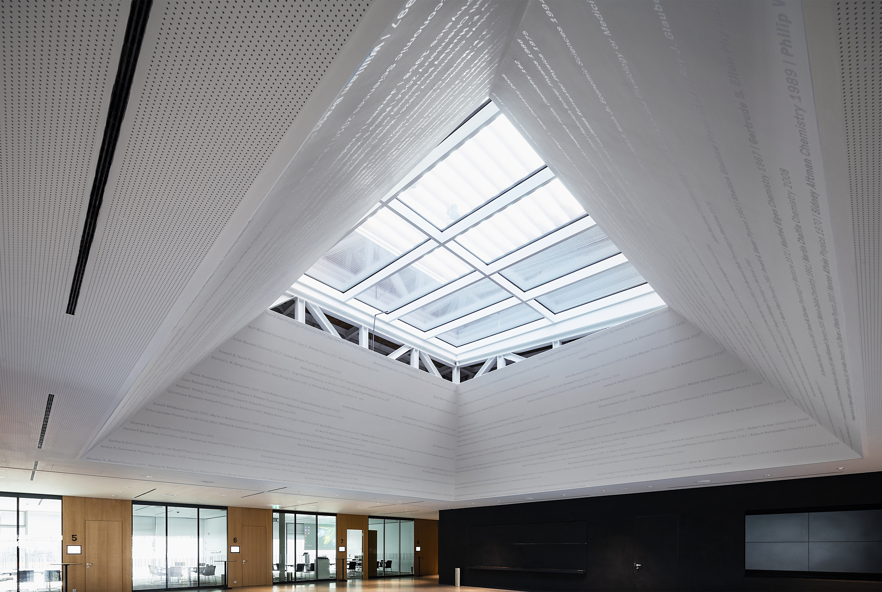 Im Foyer nutzen wir die Deckenfläche, um die Wegführung sichtbar zu signalisieren. Das Oberlicht-Trapez im Foyer dient zur Dokumentation ausgezeichneter Forscherinnen und Forscher.