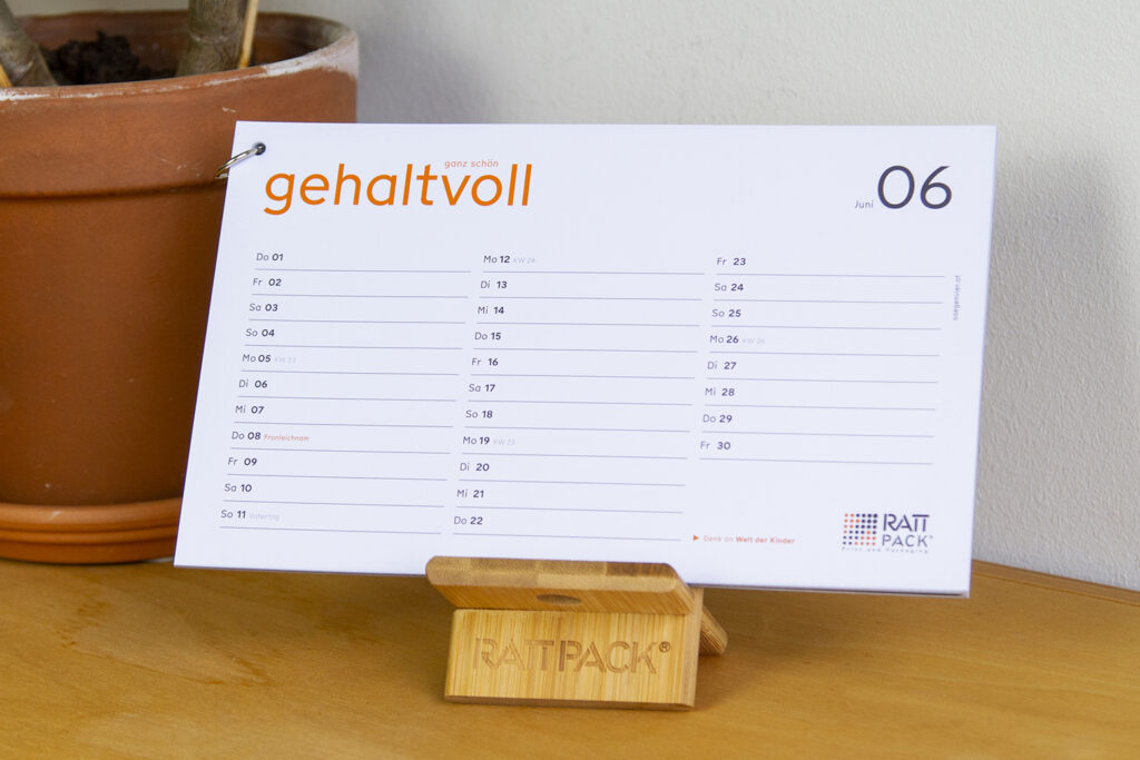 35 Jahre lang haben wir den jährlichen Wandkalender für die Druckerei Wenin gestaltet. Und sehr oft durften wir Inhalte mit sozialen Themen einbringen. Aus dem Wandkalender ist jetzt ein Tischkalender entstanden. Dieser wurde von der RattPack Gruppe beauftragt und sollte ab jetzt auch jährlich erscheinen. Gerade in diesen Zeiten des Weltgeschehens war uns wichtig, Menschen zu präsentieren, die was Gutes und Kluges für Menschen machen. Jeden Monat kann man sich ein anderes Projekt für eine Spende oder ein Engagement aussuchen. Ganz schön Mensch, eben! Danke an Tina Rhomberg für die excellente Gestaltung und Organisation der Materialien. Danke an alle, die uns ihre Projekte beschrieben haben. Und bitte spendet fleissig.