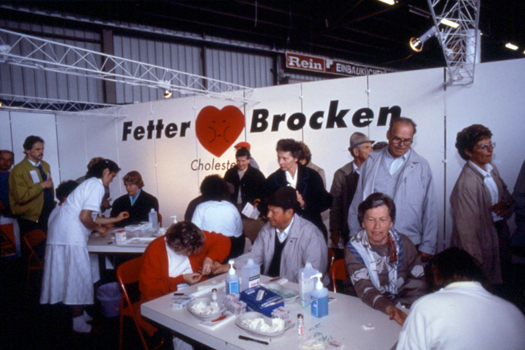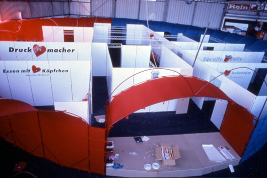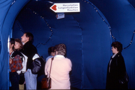 Für die Agentur Meraner und Schneider habe ich diese Messestandgestaltung gemacht. Feine und offene Zusammenarbeit mit Peter Meraner. Heute betreibt er eine Bar in Wien und lebt auch dort. Für die Vorsorge- und Sozialmedizin war diese Reise ins Herz inszeniert. Die BesucherInnen konnten durch die Schlagadern wandern und die Risiko- und Gesundheitsinformationen so auf lustige Art erfahren, bzw. erlaufen. Und man konnte auch seine Herzfrequenzen und den Blutdruck messen.