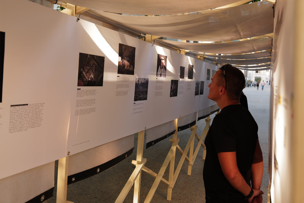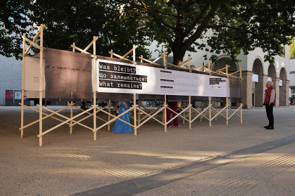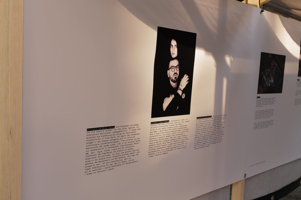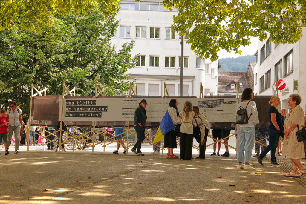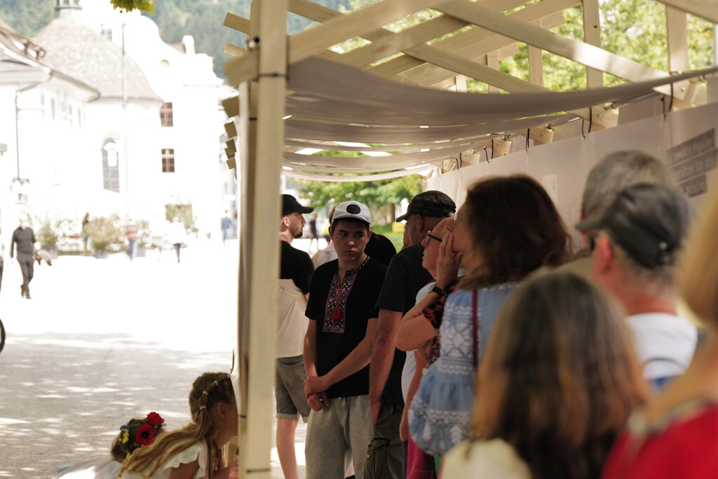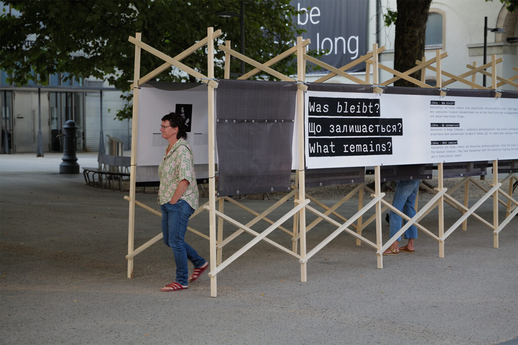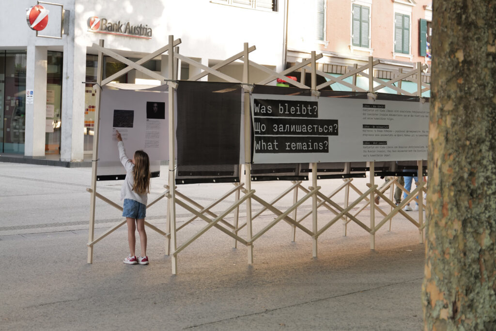 Gestern war am Kornmarkt in Bregenz die Feier des Tages der Unabhängigkeit der Ukraine. Yuliia Zaiats vom Ukraine Verein Vorarlberg hat uns gebeten, die Gestaltung für die Fotoausstellung von Vlada und Konstyantyn Liberov zu übernehmen. Das Konzept, eine Art Tunnel zu entwerfen war schon gegeben und Martin Bereuter hat die Konstruktion entworfen, im Prozess entwickelt und mit seinem Sohn Fridolin gebaut. Leonie und unsere Praktikantin Lisa aus St. Gallen haben die Gestaltung und Organisation übernommen und in Windeseile diese superfeine Ausstellung mit-verwirklicht. Und nicht zu vergessen – unser Max Wenin von S9 hat uns die Gestaltungen gedruckt und bei den Montageideen geholfen. Lucas war mit Lisa da auch mit voller Power behilflich. Die Bilder hat Martin Bereuter gemacht.