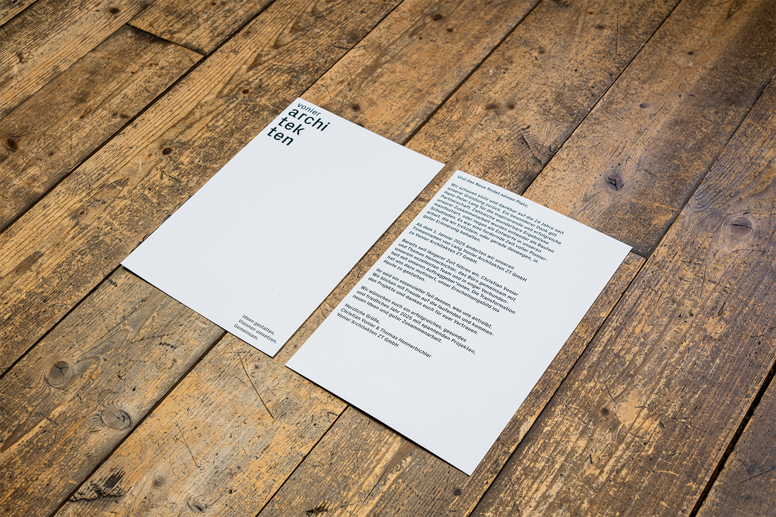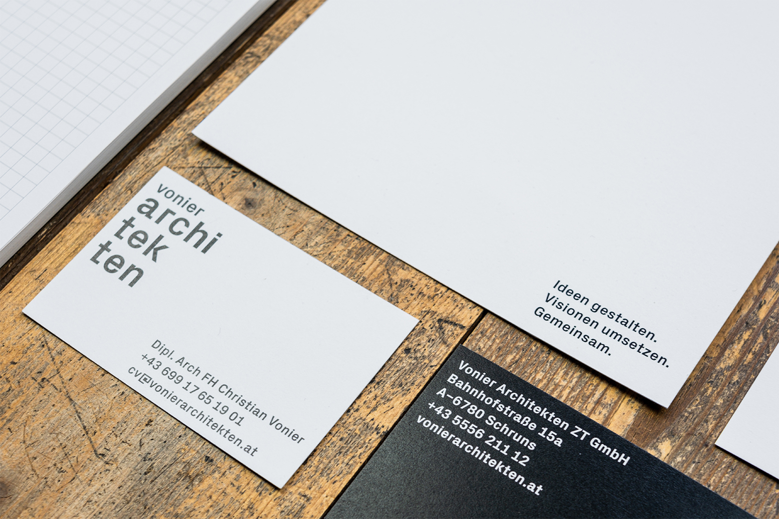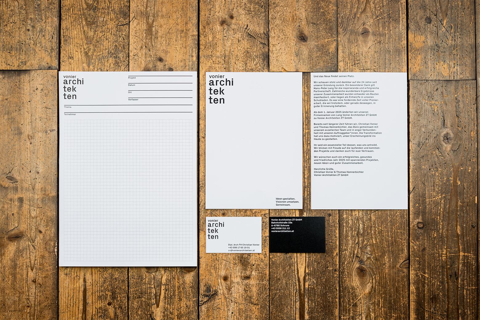 Christian Vonier und Thomas Hennerbichler haben neu firmiert. Aus Lang Vonier Architekten wurde nun Vonier Architekten und wir dürfen für das neue Corporate Design verantwortlich zeichnen. Jetzt folgt dann noch die neue Website und die Bürobeschriftung. Danke für die langjährige und treue und jetzt erfrischt neue Zusammenarbeit. Juhu! Und danke an Tim Siegel für die gehaltvolle und schöne Gestaltung.