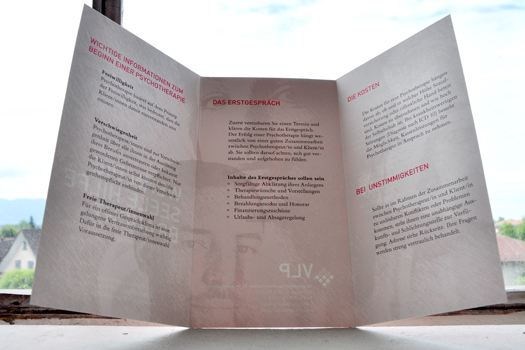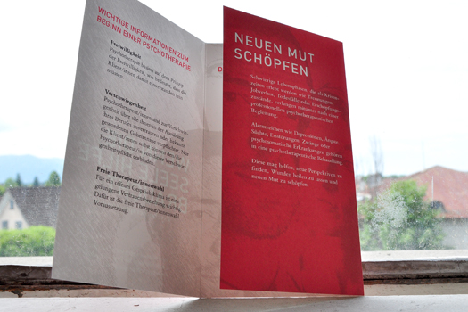 Roswitha Natter hat diese Broschüre für den Vorarlberger Landesverband für Psychotherapie gestaltet. Erste Hilfe für seelenleidgeplagte Menschen. Kann man in der heutigen Zeit nicht genug zur Verfügung stellen…