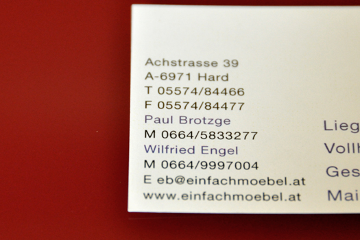 Unsere Freunde der Tischler-Handwerks und Design-Kunst Wilfried Engel und Paul Brotzge sind eine unserer treuesten Auftraggeber und am Start gestalteten wir eine Logotype aus E und B und die Firma hiess „Tischlerei Engel und Brotzge“. Schon damals waren die beiden so weitsichtig, dass die Webdomain „einfachmoebel.at“ genannt wurde. Dies war meiner Meinung nach sehr visionär. Mittlerweile ist Wilfried in den verdienten Ruhestand übergegangen und die Firma heisst jetzt Paul Brotzge. Und das einfach möbel gilt immer noch als Erkennungsmerkmal und passt super. So geht Kommunikationsarchitektur.