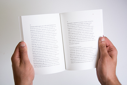 Ein ganz besonderes Büchlein durften wir für Walter Buder gestalten. Mit viel Leidenschaft und Gefühl hat Monika Schnitzbauer die Gedichte gesetzt und in Kombination mit Offsetdruck (Hecht Verlag und Druck) und Siebdruck (Druckwerk Lustenau) ein ganz eigenwilliges und eigenständiges Büchlein gestaltet. Der Umschlag im Siebdruck macht jedes einzelne Exemplar zu einem Unikat. Gratuliere zu einem, wie ich meine, schönsten Buch der Welten… Und für die sehr feine Fotodokumentation für unsere Website zeichnet Leonie Ramoser verantwortlich.