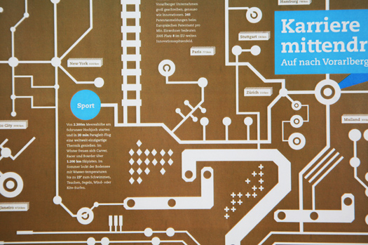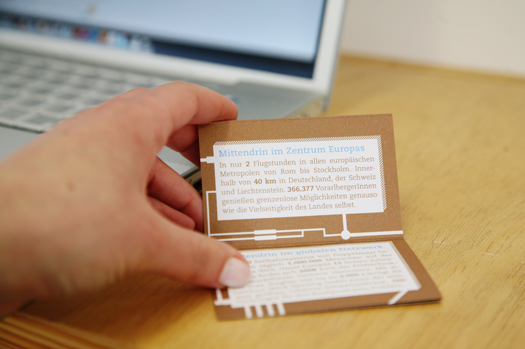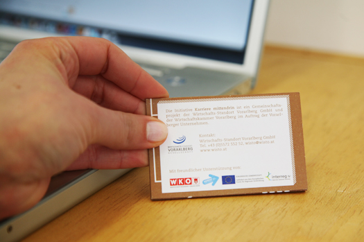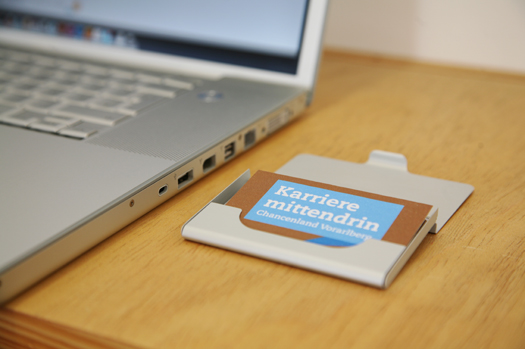 Im Auftrag von Wirtschaftsstandort Vorarlberg – Wisto – gestalteten wir das Branding für die Job-Such-Angebotsplattform im Ländle. Auch das Naming ist von uns. Ein kleiner Messestand dient als Info-Box für Bildungsmessen, Ausstellungen, etc. Die Leiterplattform symbolisiert die Energie-Industrie-Bereich. Mit Visitenkartenboxen und Minifolder bzw Visitenkarten bewerben wir die Internetplattform. Karriere übers Web.