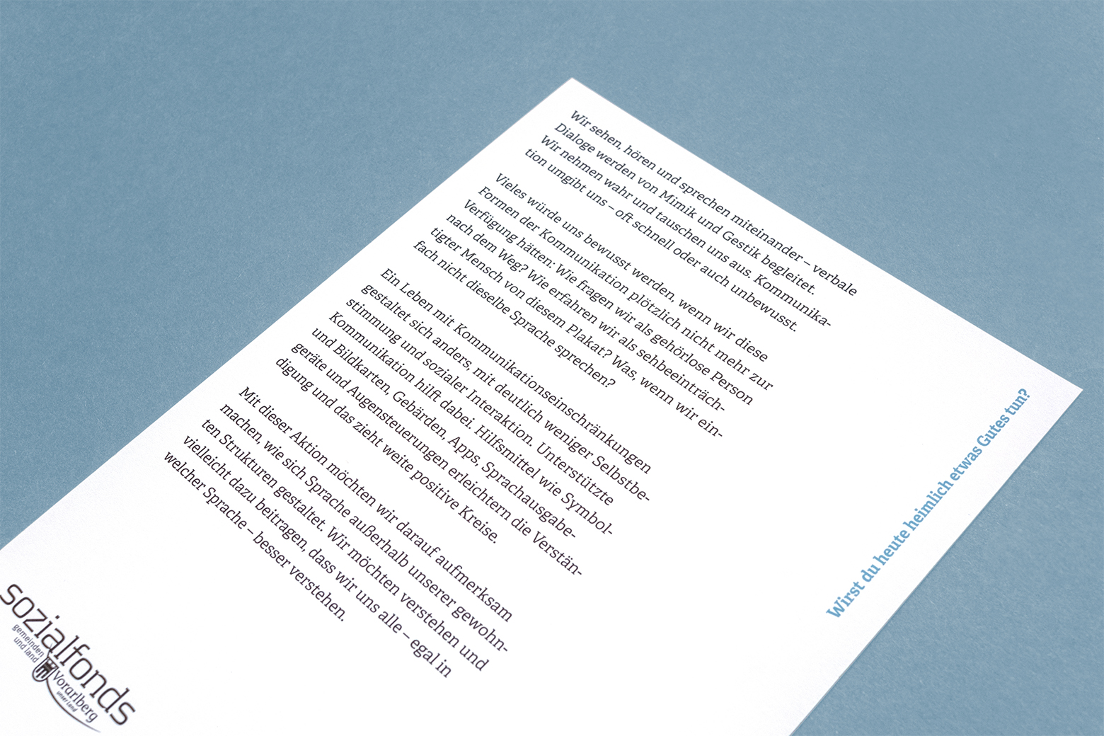 Kurz vor Weihnachten ist die Lebenshilfe auf uns mit diesem superschönen Projekt zugekommen. Es geht um die Unterstützte Kommunikation. Mit dieser Aktion möchten wir darauf aufmerksam machen, wie sich Sprache außerhalb unserer gewohnten Strukturen gestaltet. Wir möchten verstehen und vielleicht dazu beitragen, dass wir uns alle – egal in welcher Sprache – besser verstehen. Danke an Tina Rhomberg für die feine Klinge und die klaren Worte und danke an die Lebenshilfe für die vertrauensvolle und zugewandte Zusammenarbeit. Juhu!