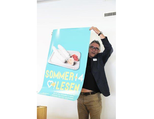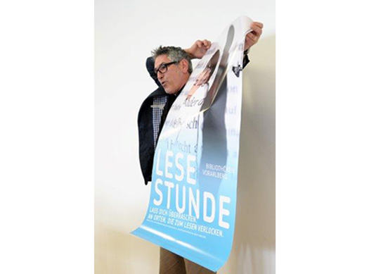 Am Samstag den 22.3. 2014 durfte ich vor gut 200 BibliothekarInnen in Batschuns unsere Lese-Motivations-Kampagnen für 2014 vorstellen. Sommerlesen ist bereits zum 3. Mal. Hier haben Lena Seeberger und unsere Praktikantin Claudia Kaufmann 2 neue Sujets gestaltet. Die anderen 3 Plakatmotive wurden farblich adaptiert. Und das neue Projekt, die Lesestunde – hier lesen BibliothekarInnen ihr Lieblingsbuch an überraschenden und unüblichen Orten. Eine schöne partizipative Kommunikationsinitiative. Die Menschen in Vorarlberg gehen zwar österreichweit am häufigsten Bücher und Medien ausleihen, aber wenn alles gut läuft, dann soll Werbung gemacht werden. Wir gehen zu den Leuten auf die Straße und an Plätze. Schön, daß soviele mitmachen. Tolle Aktion. Die Plakate wurden von Lena Seeberger und Sigi gestaltet. Danke an Dr. Ulrike Unterthurner für die offene und mutige Zusammenarbeit. Übrigens hat der Beamer bei der Präsentation nicht funktioniert. Spontan hatte ich mich für die analoge Präsentation entschieden, dies war nicht weniger lustig und überzeugend. Zum Glück hatte ich Originalplakatdrucke dabei. Und übrigens die Fotos hat Christine Kees gemacht.