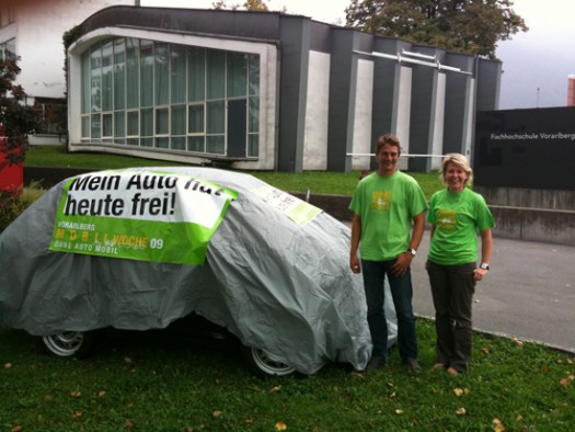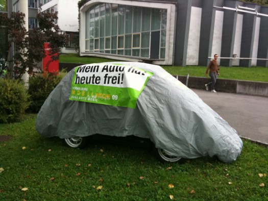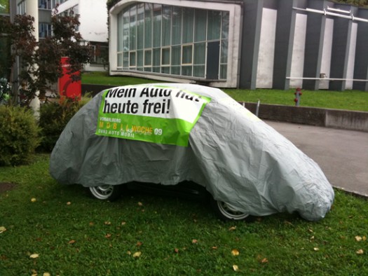 Aktionismus ist am „Ohne Auto Mobil Tag“ angesagt. Dieses Jahr verhüllen wir Autos und stellen sie an exponierte Plätze. Über 130 solcher Fahrzeuge stehen im Land herum. Man könnte auch meinen, es sind Aktivistenzelte. Aber auch das gefällt uns und passt zur Guerilla-Marketing-Aktion. Feldkirch hat sich noch eine spezielle Aktion dazu ausgedacht. Die FeldkircherInnen können mit einem Kleber ihr Auto mit dem freien Tag kennzeichnen. Mein Auto hat heute frei…