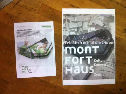 Momentan ist es noch eine Baustelle, das neue Montforthaus in Feldkirch. Für die erste Akquise hat Monika Schnitzbauer nun eine Broschüre konzipiert und gestaltet, mit offener Fadenbindung am Rücken – sieht gewollt unfertig aus, aber ist schön und erregt Aufmerksamkeit!