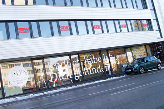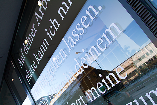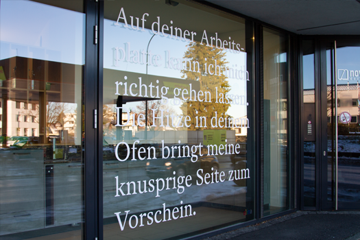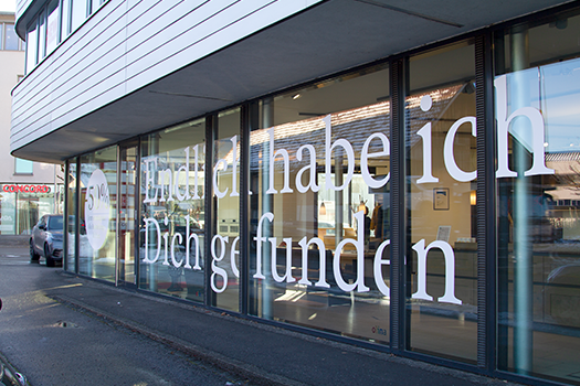 Hier sieht man, was Signaletik in höchster Markentingqualität kann. Gebäudebeschriftung und Anspruch auf eine Idee. Kurzfristig und in konzeptivem Ablauf. Ich lese im Zeitmagazin unter den anderen super Berichten immer gerne die Partnersuch-Anzeigen. Diese sind immer anspruchsvoll und kreativ formuliert. Diese Idee haben wir uns hier zum Muster gemacht. Sie sucht, Sie hat gefunden, wir ziehen zusammen…