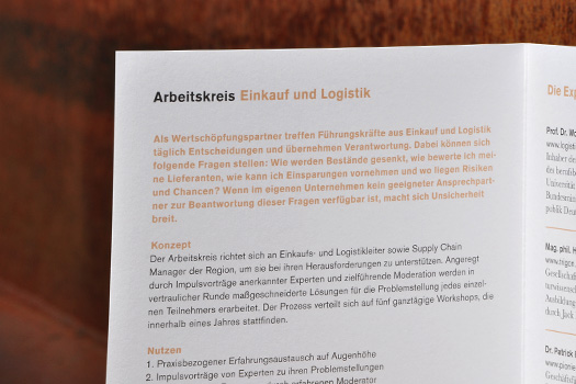 Rechtzeitig zum 1. Geburtstag unseres Auftraggebers wurde der Infofolder fertig. Über den Tellerrand schauen ist eine Devise des Unternehmens. Sie organisieren Arbeitskreise für Führungskräfte. KonkurrentInnen bzw. MitbewerberInnen tauschen sich zu relevanten Themen aus und erarbeiten gemeinsam Lösungen, die sie dann in ihren Betrieben umsetzen können. Das wäre vor 10 Jahren noch undenkbar gewesen. Stopp dem Wissenstresor. Neues Denken ist angesagt.