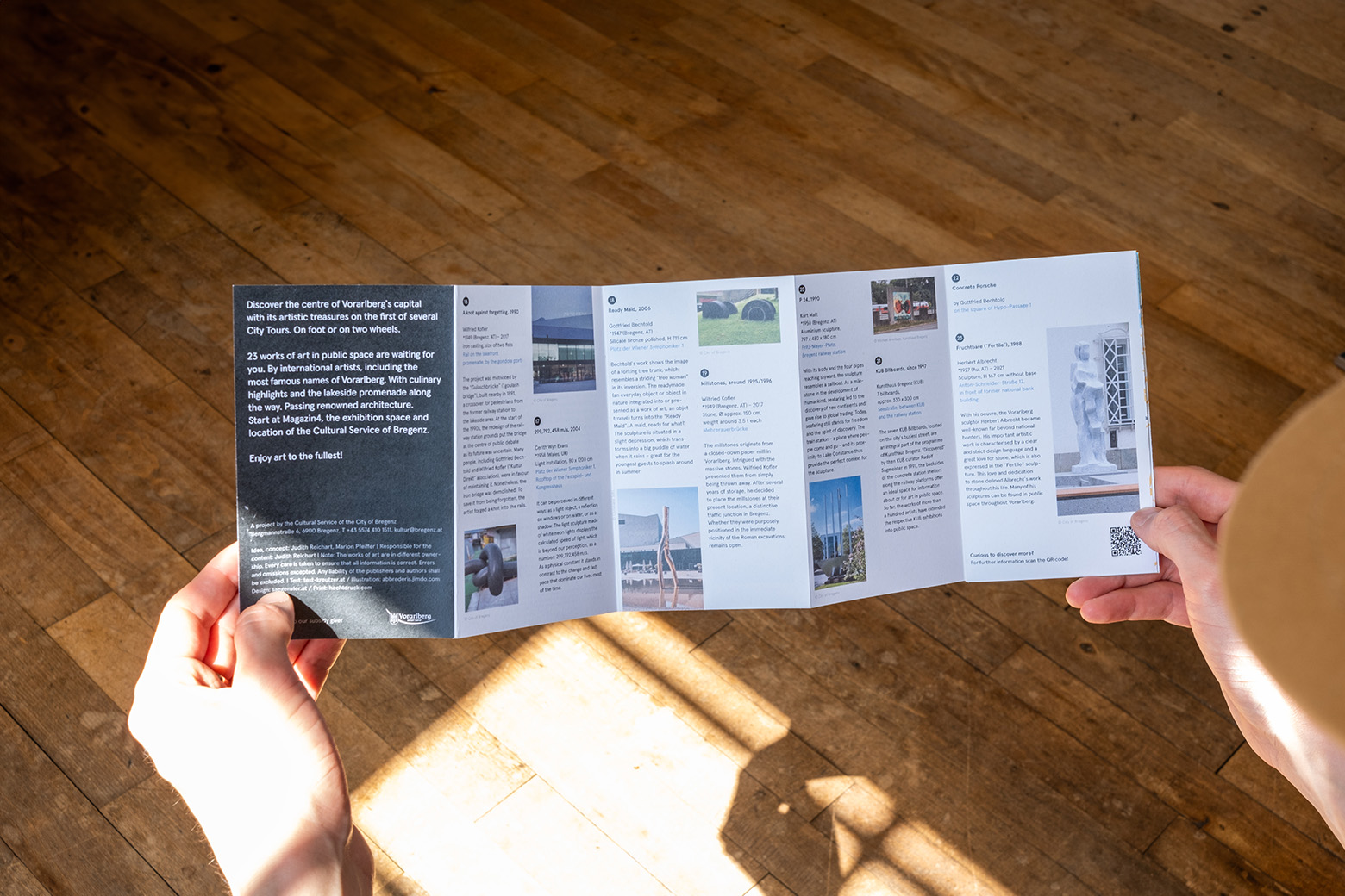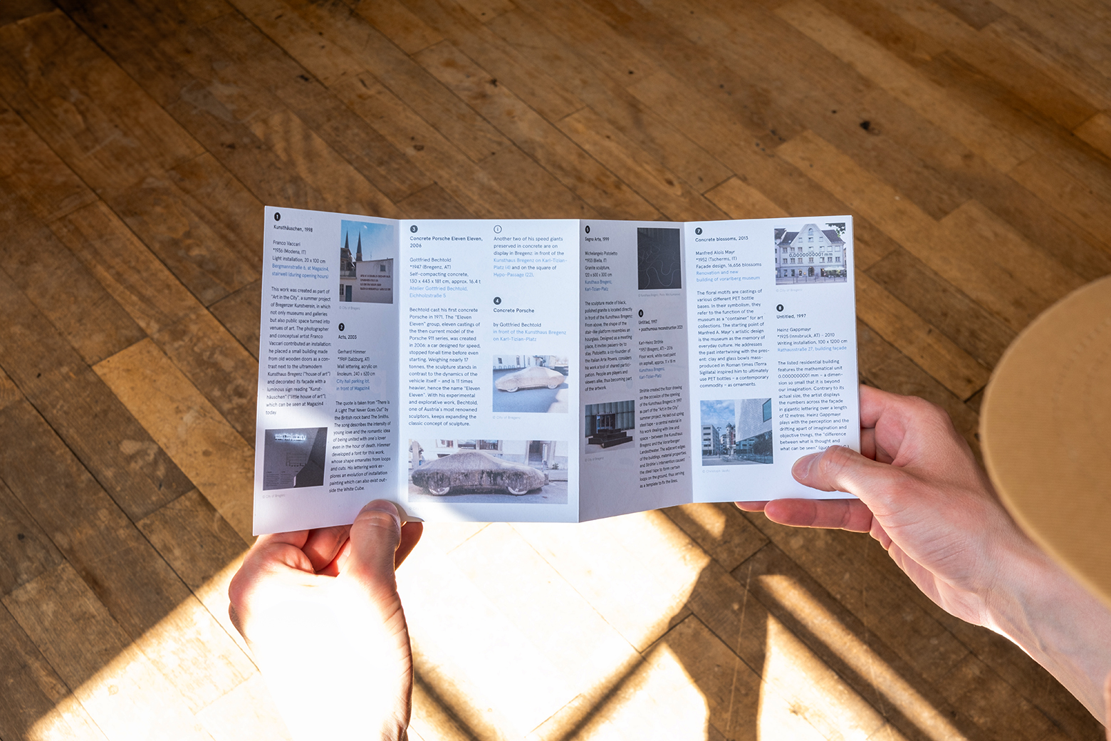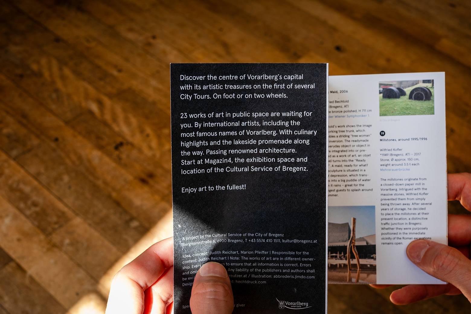 Was da unsere Lisa wieder gezaubert hat… angefangen hatte es mit der Idee einer app, mit der Ziele in Bregenz zu Fuß, mit dem Rad oder den Öffis zu erreichen sind mit Kultur-Orten. Daraus ist jetzt ein kleines Corporate Design und dieser smarte Folder entstanden.