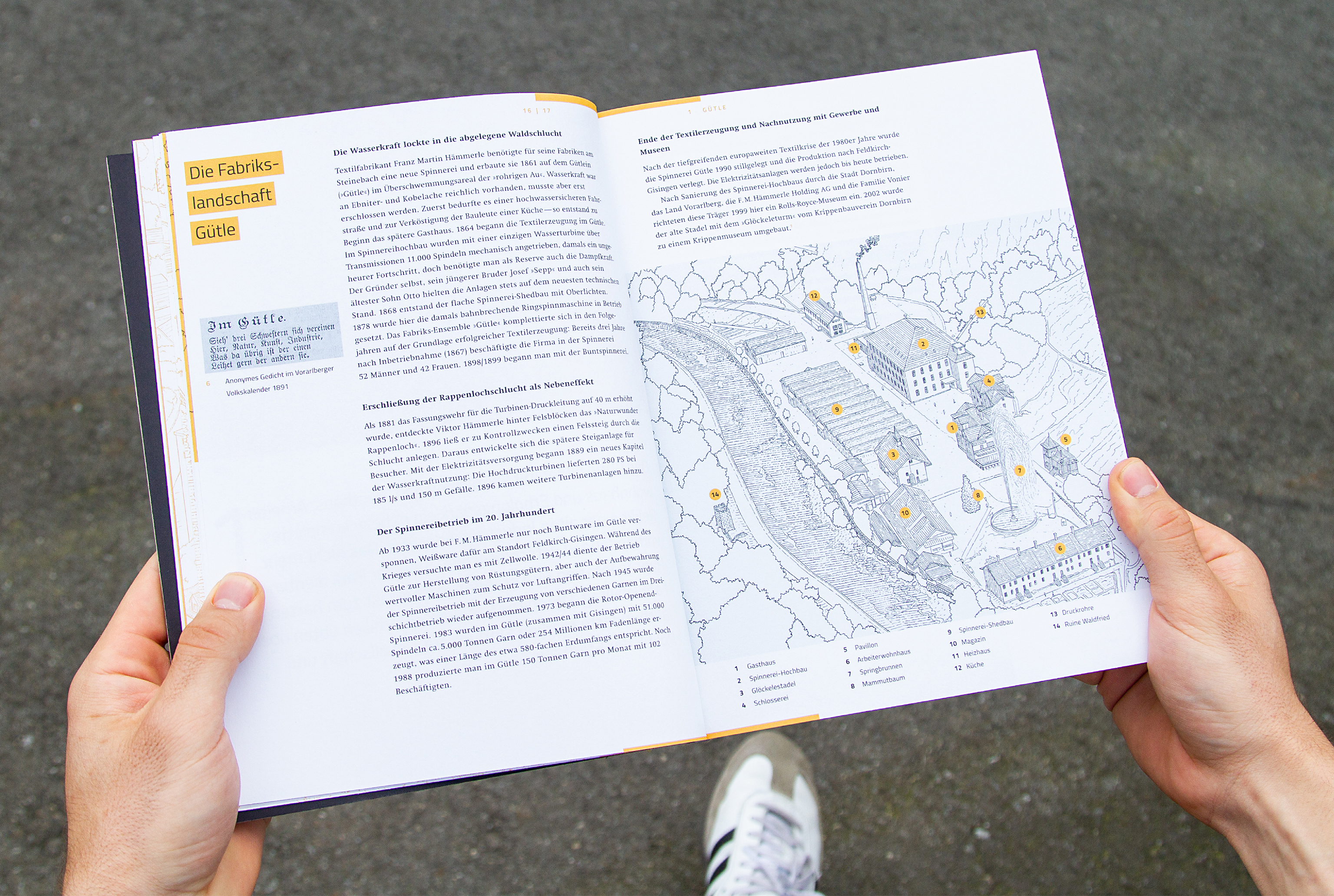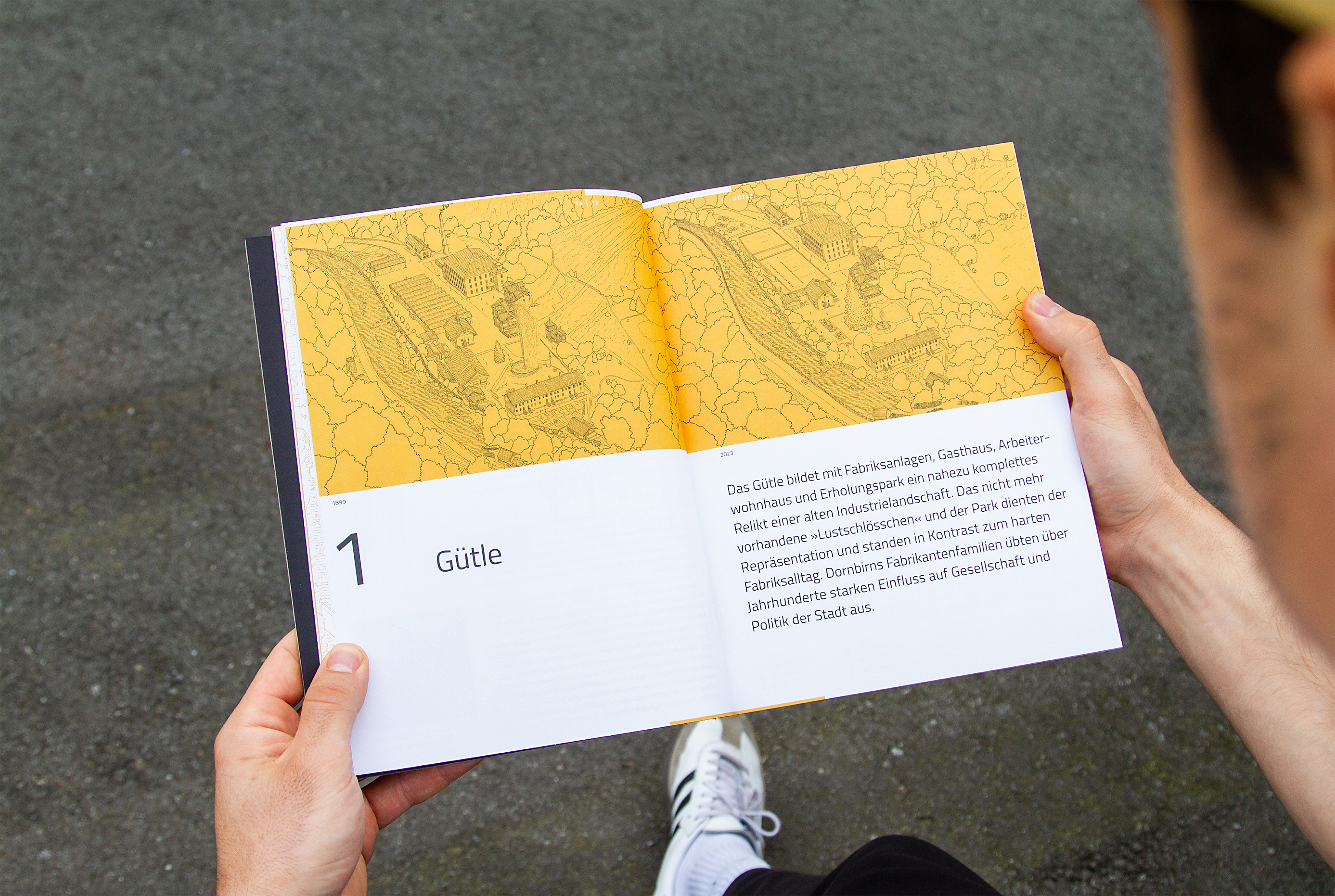 Herangehensweise: Die rund 6,5 km lange Route folgt den ältesten Weberei- und Spinnereibetrieben entlang der Dornbirner Ach und des Müllerbachs, vom Gütle bis ins Forach. An jeder Station werden zwei Themen behandelt. So können sich die Besucherinnen und Besucher über die erste Tüll-Fabrik der Monarchie oder den größten Websaal Österreichs informieren. Ergänzend zu den Stationen des Trails und einem Buch mit weiterführenden Texten und Illustrationen durften wir eine App mitentwickeln und gestalten – ein ideales Instrument für Schulklassen und historisch Interessierte. Sie leitet von Station zu Station und bietet zusätzliche Medien wie Filme, Interviews oder Audiodateien an.