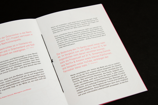 Für die PsychoSoziale Gesundheitsdienste Vorarlberg GmbH – ab sofort Pro Mente Vorarlberg GmbH haben wir dieses Erscheinungsbild entworfen. Mit einer Offsetplatte – Inhalt Textur mit Texten aus Patientengesprächen bildeten wir ein Stilelement mit dem es möglich wurde, sämtliche Drucksachen mit Einfarben-Aufdruck zu generieren. Einladungskarten, Folder, Lesezeichen, Bucheinbände, Plakate… Alles hält zusammen und ist doch so eigenständig und lebendig. Die Druckerei haben wir einfach einen halben Tag gemietet und mit Makulatur und Papierumdreh-Experimenten konnten wir diese grafischen Muster und Untergründe „designen“. Analog und digital. Und eine erste kleine feine Signaletikarbeit mit den Textfragmenten als Beschattung ist damals auch entstanden.