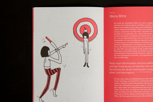 Ohne die vorigen Projekte zu schmälern – aber dies ist doch einer der feinfühligsten und so wunderbar illustrierten Beiträge für unsere konzepierte Serie für die Jahresberichte von Pro Mente V. Danke an die Illustratorin Sonja Stangl und an unsere Lisa Fink für die feine Gestaltungsklinge und an Pro Mente V und das Team, das immer selber dazu hilft, damit die Beiträge inhaltlich so gehaltvoll und schön gestaltet werden dürfen.