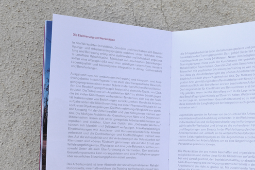 Für die PsychoSoziale Gesundheitsdienste Vorarlberg GmbH – ab sofort Pro Mente Vorarlberg GmbH haben wir dieses Erscheinungsbild entworfen. Mit einer Offsetplatte – Inhalt Textur mit Texten aus Patientengesprächen bildeten wir ein Stilelement mit dem es möglich wurde, sämtliche Drucksachen mit Einfarben-Aufdruck zu generieren. Einladungskarten, Folder, Lesezeichen, Bucheinbände, Plakate… Alles hält zusammen und ist doch so eigenständig und lebendig. Die Druckerei haben wir einfach einen halben Tag gemietet und mit Makulatur und Papierumdreh-Experimenten konnten wir diese grafischen Muster und Untergründe „designen“. Analog und digital. Und eine erste kleine feine Signaletikarbeit mit den Textfragmenten als Beschattung ist damals auch entstanden.