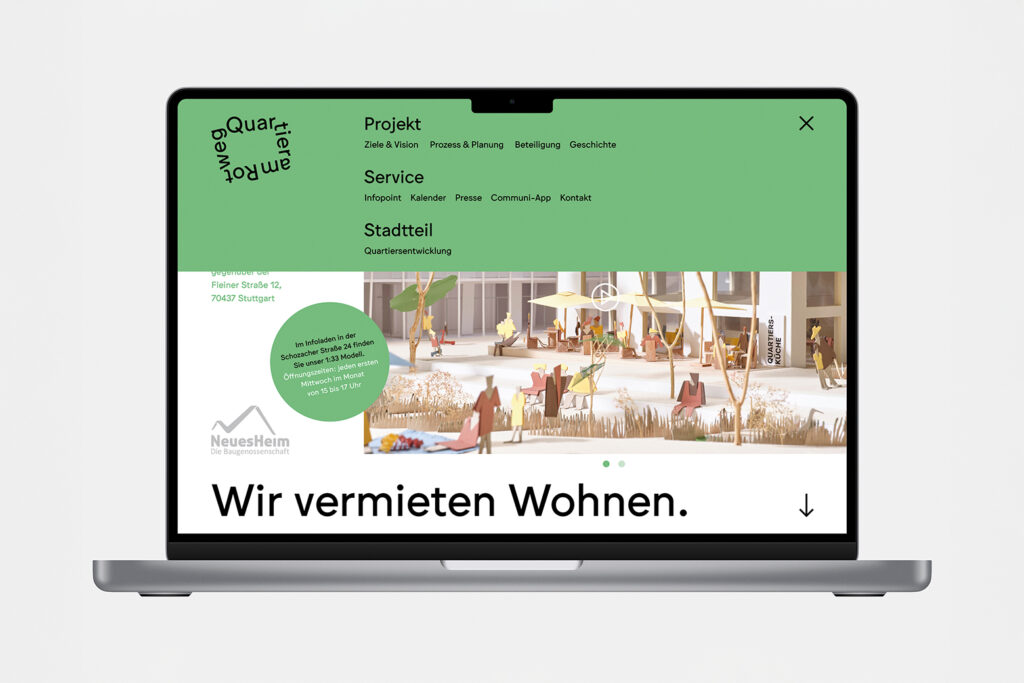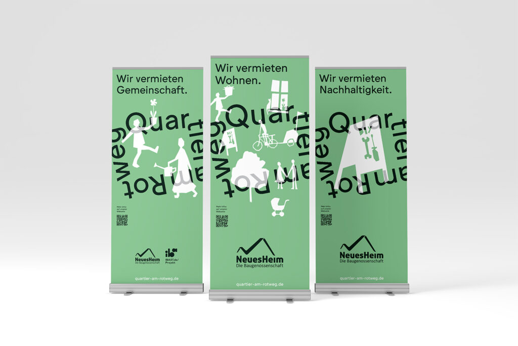 Die ersten Kommunikationsmittel sind draussen und online. Das Quartier am Rotweg ist ein genossenschaftlich getragenes Wohn- und Lebens-Mietprojekt inmitten Stuttgart Rot. Wir sind auf dieses Projekt ganz besonders stolz, denn die Quartiersentwicklung in dieser vorbildhaften Form und Vorgangsweise und die Haltung dahinter ist überaus zeitgemäß und sehr umfassend entwickelt. Neues Heim und BGZ sind die Genossenschaften, die für die Verwirklichung verantwortlich sind. Dafür das Branding und die Kommunikation zu gestalten, ist eine große Ehre und Freude. Wir freuen uns auf die nächsten Schritte. Juhu! Und übrigens – diese Ortsentwicklung wird auch als eines der Vorzeigebeispiele von der IBA Stuttgart begleitet und dann ausgestellt.