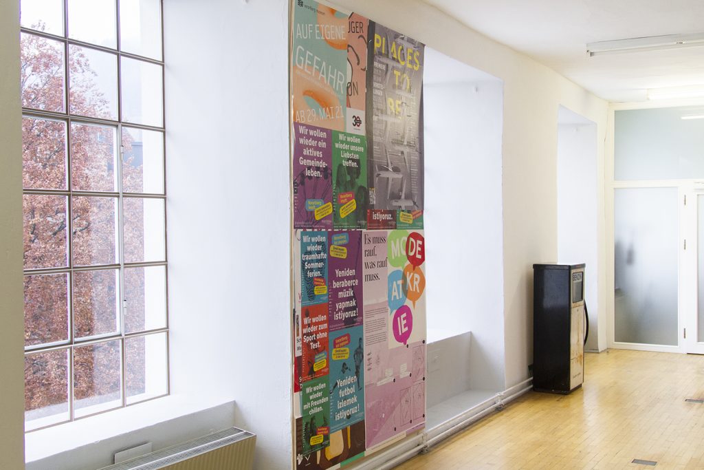 Unsere Plakatwand im Gang zur Säge wird immer dicker. Und nicht uninteressant – die Themen schärfen sich in Richtung Covid und der Pandemie. Erwin kleistert und fotografiert diese Arbeiten und wir schauen mit dieser Dokumentation, wie sich die Dinge entwickeln.