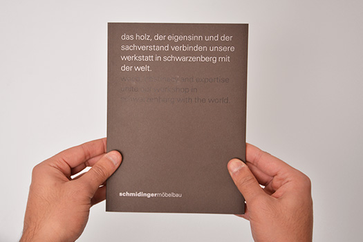 Auf Basis des Erscheinungsbildes von Stefan Gassner dürfen wir die Kommunikationsmittel weiterentwickeln. Schmidinger baut Möbel wie Pau Casals das Cello zum Klingen, Weinen, Schreien und Singen bringt. Also ein Inserat im Schubertiade-Heft passt wie angegossen.