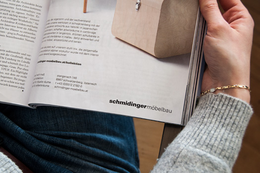Auf Basis des Erscheinungsbildes von Stefan Gassner dürfen wir die Kommunikationsmittel weiterentwickeln. Schmidinger baut Möbel wie Pau Casals das Cello zum Klingen, Weinen, Schreien und Singen bringt. Also ein Inserat im Schubertiade-Heft passt wie angegossen.