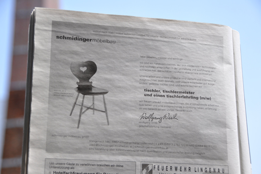Ein neuer feiner Auftraggeber. Für Wolfgang Schmidinger hat Stefan erste Personalinserate getextet und gestaltet. Jetzt gehts weiter mit der neuen Internetseite. Wir freuen uns sehr.