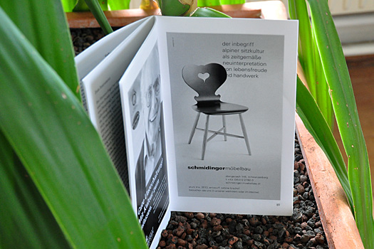 Auf Basis des Erscheinungsbildes von Stefan Gassner dürfen wir die Kommunikationsmittel weiterentwickeln. Schmidinger baut Möbel wie Pau Casals das Cello zum Klingen, Weinen, Schreien und Singen bringt. Also ein Inserat im Schubertiade-Heft passt wie angegossen.