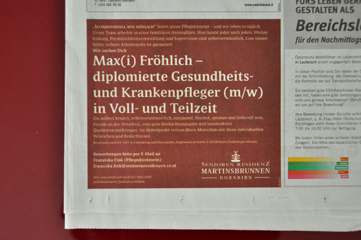 Monika Schnitzbauer hat diese VN Inserate gestaltet. Die Headline stammt von Hermann Brändle. Probieren geht über Studieren und wir haben versucht, einmal etwas anders zu texten. Mal sehen, wer und wieviele sich melden.