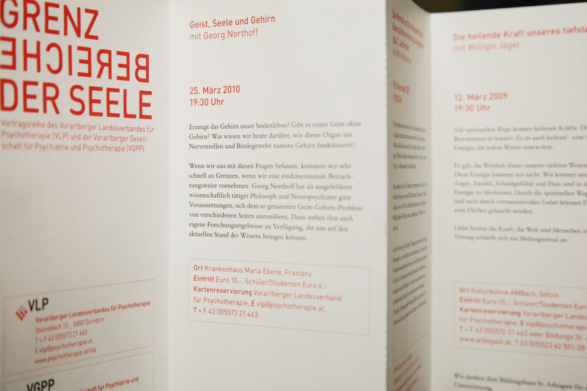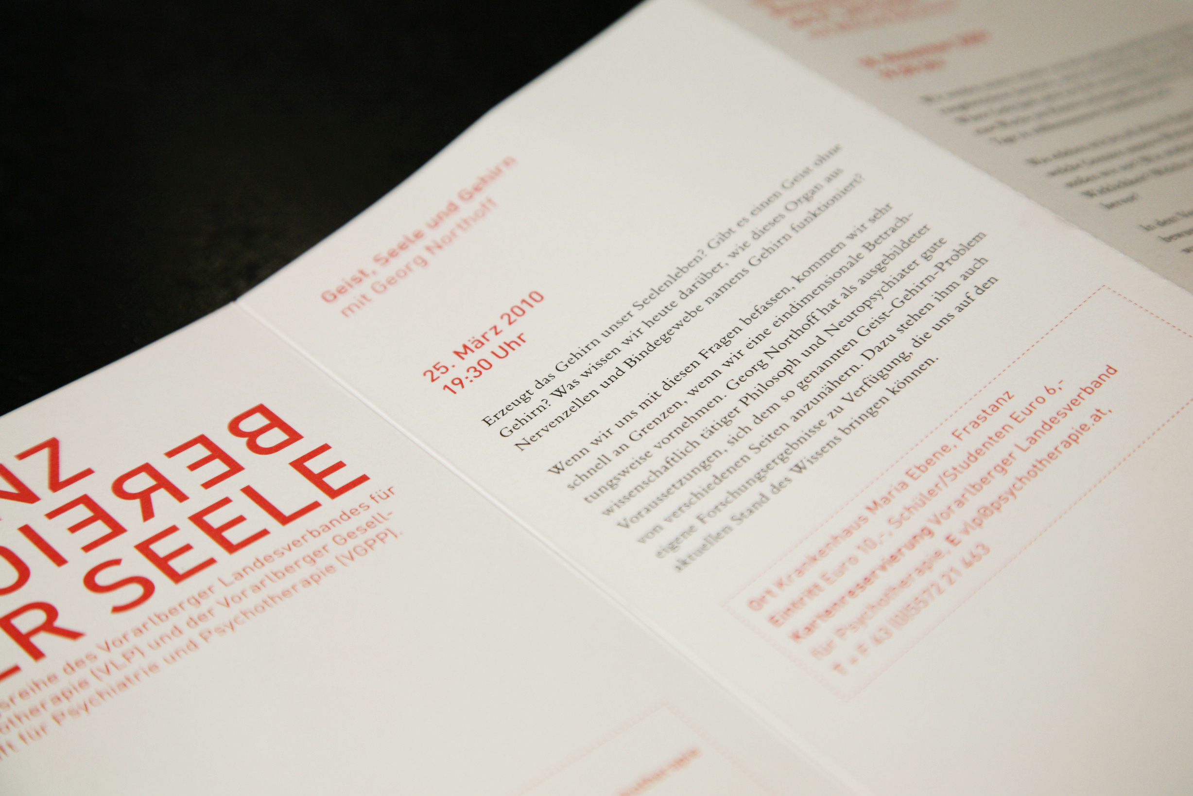 Für die PsychoSoziale Gesundheitsdienste Vorarlberg GmbH – ab sofort Pro Mente Vorarlberg GmbH haben wir dieses Erscheinungsbild entworfen. Mit einer Offsetplatte – Inhalt Textur mit Texten aus Patientengesprächen bildeten wir ein Stilelement mit dem es möglich wurde, sämtliche Drucksachen mit Einfarben-Aufdruck zu generieren. Einladungskarten, Folder, Lesezeichen, Bucheinbände, Plakate… Alles hält zusammen und ist doch so eigenständig und lebendig. Die Druckerei haben wir einfach einen halben Tag gemietet und mit Makulatur und Papierumdreh-Experimenten konnten wir diese grafischen Muster und Untergründe „designen“. Analog und digital. Und eine erste kleine feine Signaletikarbeit mit den Textfragmenten als Beschattung ist damals auch entstanden.