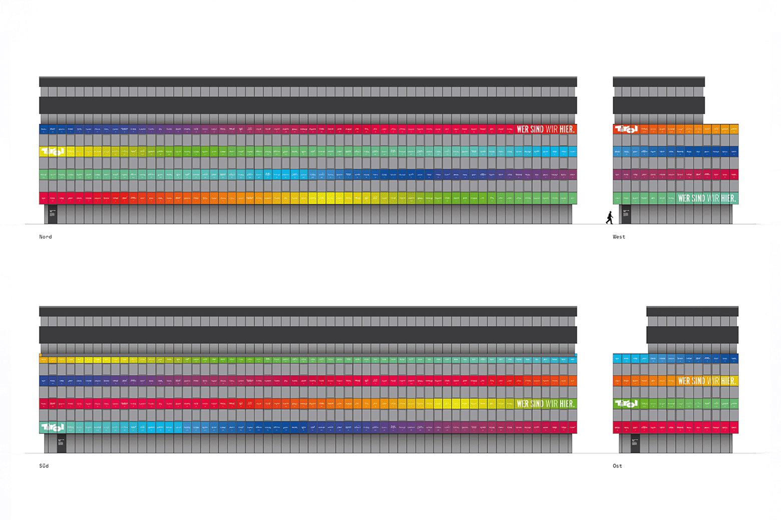 Im 2stufigen Wettbewerb wurden 7 Büros aus Österreich und Südtirol geladen und wir haben diese 2 Entwürfe eingereicht und präsentiert. Den einen mit der Idee und der Gestaltung von tOmi Scheiderbauer. Wer sind wir hier in Tirol? – Daten aus dem aktuellen Meldeamt, wieviele Menschen aus welchen Nationalitäten im Tirol leben und gemeldet sind. Die zweite Idee – die Bergketten Tirols in einer nichtinterpunktierten Typografie, die das Gebäude bzw. deren Berg-Himmelsrichtungen spiegelt. Leider sind wir mit diesen beiden Entwürfen nicht weitergekommen. Also geht es weiter im Sauseschritt…